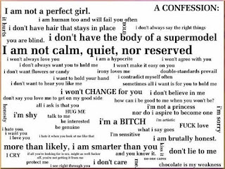 I am not a perfect girl. I am human too and will fail you often I don't have hair that stays in place I don't have the body of a supermodel I am not calm, quiet, nor reserved I won't always love you I am a hypocrite I won't agree with you Irony loves me Double-standards prevail Don't say you love me to get on my good side | All I ask is that you HUG ME I'm shy Talk to me Be interested Be genuine I'm a bitch Fuck love What I say goes I'm sensitive I am brutally honest Don't lie to me More than likely, I am smarter than you, and you know it Protect me I see right through you | I cry Chocolate is my weakness I'm artistic Sometimes all I want is for you to hold me I won't make it easy on you I don't want to hear you like me Honesty I hate you I want you I love you No one cares I'm not a princess nor do I aspire to become one I don't always say the right things You are blind |